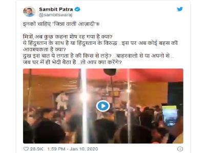 बीजेपी के राष्ट्रीय प्रवक्ता संबित पात्रा ने अपने अधिकारिक ट्विटर हैंडल पर लिखा, ''इनको चाहिए “जिन्नाह वाली आजादी”! मित्रों,अब कुछ कहना शेष रह गया है क्या?