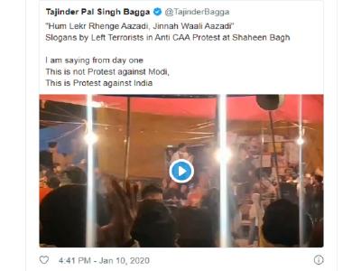तजिंदर पाल सिंह बग्गा ने लिखा, 'हम लेकर रहेंगे आजादी, 'जिन्नाह' वाली आजादी' ये नारा लेफ्ट के लोगों ने सीएए विरोध में दिल्ली में शाहीन बाग में लगाया है।