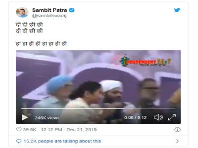 संबित पात्रा के इस ट्वीट पर 10 हजार से ज्यादा रिट्वीट है और 40 हजार लाइक्स हैं। ममता बनर्जी इस वीडियो में सीएए और एनआरसी का एक अलग ही अंदाज में विरोध कर रही हैं।