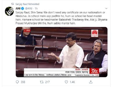नागरिकता संशोधन विधेयक -2019 को आज (11 दिसंबर) राज्यसभा में पेश किया गया है। राज्यसभा में नागरिकता संशोधन बिल पर चर्चा करते हुए शिवसेना नेता संजय राउत ने कहा, 'आज देश के कई हिस्से में बिल का विरोध हो रहा है। वह भी देश के नागरिक हैं। हमें किसी से देशभक्ति का प्रमाणपत्र देने की जरूरत नहीं हैं, हम कितने कठोर हिंदू हैं, उसका प्रमाण पत्र भी हमें नहीं चाहिए, क्योंकि जिस स्कूल में आप (बीजेपी) पढ़ते हैं, वहां के हम हेडमास्टर हैं। बाला साहेब हमारे हेडमास्टर थे। अटल जी भी थे। श्यामा प्रसाद मुखर्जी भी थे।' राज्यसभा में चर्चा के बाद जैसे ही संजय राउत ने इस बयान को अपने अधिकारिक ट्विटर हैंडल पर शेयर किया है। लोगों ने कमेंट कर उनको ट्रोल करना शुरू किया।