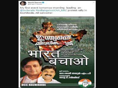 नागरिकता संशोधन कानून और एनआरसी के खिलाफ विरोध करने वाले कांग्रेस के वरिष्ठ नेता शशि थरूरट्विटर अपने एक ट्वीट को लेकर जमकर ट्रोल हो रहे हैं। हालांकि शशि थरूर ने अपना ट्वीट डिलीट कर दिया था। लेकिन तब-तक उसका स्क्रीनशॉट वायरल हो गया है। शशि थरूर ने भारत का विवादित नक्शा ट्वीट किया था। थरूर ने केरल के कोझिकोड में होने वाले प्रदर्शन को लेकर ट्वीट किया जिसमें उन्होंने पाक अधिकृत कश्मीर (पीओके) और अक्साई चिन को भारत का हिस्सा नहीं दिखाया था। अपने इस ट्वीट के बाद शशि थरूर ट्रोल होना शुरू हो गए हैं। बढ़ते विवाद के बाद शशि थरूर ने अपने विवादित ट्वीट को डिलीट कर दिया।