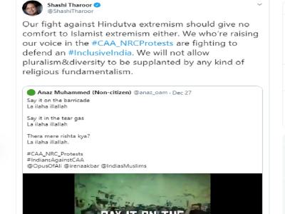 कांग्रेस के वरिष्ठ नेता शशि थरूर अपने ट्वीट को लेकर चर्चा में आ गए हैं। ट्विटर पर #ShashiTharoor #Hindutva और #Islam ट्रेंड होने लगा है। इस हैशटैग के साथ लोग शशि थरूर की आलोचना कर रहे हैं। दिल्ली यूनिवर्सिटी जामिया मिलिया इस्लामिया में नागरिकता संशोधन कानून (CAA) को लेकर हुए विरोध प्रदर्शन में एक नारा काफी मशहूर हुआ। जो था, ''तेरा मेरा रिश्ता क्या ला इलाहा इल्लल लाह, बैरिकेड के पास कहिए- ला इलाहा इल्लल लाह', लाठी चार्ज में कहिए- ला इलाहा इल्लल लाह, आंसू गैस में कहिए- ला इलाहा इल्लल लाह''। ट्विटर यूजर अनज मोहम्मद ने यह वीडियो शेयर की थी। इस वीडियो पर प्रतिक्रिया देते हुए कांग्रेस नेता थरूर ने ट्वीट किया, हमारी लड़ाई हिंदुत्व चरमपंथ के खिलाफ है, लेकिन उन लोगों की लड़ाई का फायद इस्लामिक कट्टरपंथी न उठाएं, इसका हमें ध्यान रखना होगा। हम नागरिकता संशोधन कानून (CAA) को लेकर एक समावेशी भारत के लिए लड़ रहे हैं। हम किसी भी तरह की धार्मिक कट्टरता को अपनी विविधता और बहुलवाद की जगह नहीं आने देंगे।'' ला इलाहा इल्लल लाह एक अरबी भाषा के शब्द हैं, जिसका मतलब है- अल्लाह के सिवाय कोई और ईश्वर नहीं है।