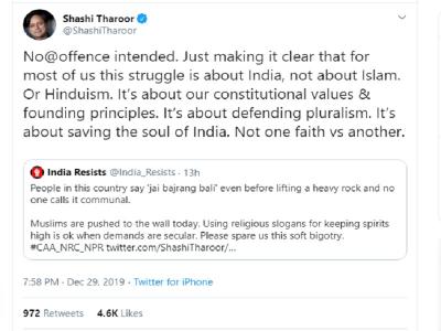 कांग्रेस के वरिष्ठ नेता शशि थरूर ने अपने वायरल ट्वीट पर सफाई देते हुए कहा कि वह किसी भी धर्म को ठेस नहीं पहुंचाना चाहते हैं। ये लड़ाई भारत के लिए है, इस्लाम या हिंदुत्व के लिए नहीं। ये लड़ाई संवैधानिक मूल्यों और स्थापित सिद्धांतों को बचाने के लिए है।