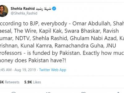 जम्मू ऐंड कश्मीर पीपल्स मूवमेंट (JKPM) की नेता शेहला राशिद ने नरेन्द्र मोदी सरकार पर निशाना साधते हुये फिर से ट्वीट किया है। शेहला राशिद ने 19 अगस्त को ट्वीट करते हुये लिखा है , बीजेपी के मुताबिक हर कोई उमर अब्दुल्ला, शाह फैसल, द वायर, कपिल काक, स्वरा भास्कर, रवीश कुमार, एनडीटीवी, शेहला राशिद, गुलाम नबी आजाद, कविता कृष्णन, कुणाल कामरा, रामचंद्र गुहा, जेएनयू प्रोफेसरों को पाकिस्तान द्वारा फंडिंग की जाती है। साफ-साफ बताइये पाकिस्तान के पास सच में कितना पैसा है? शेहला राशिद का ये ट्वीट सुप्रीम कोर्ट के वकील अलख आलोक श्रीवास्तव के शिकायत दर्ज कराने के बाद आया है। शेहला राशिद लगातार केंद सरकार द्वारा जम्मू-कश्मीर से अनुच्छेद 370 हटाए जाने के फैसले का विरोध कर रही हैं।