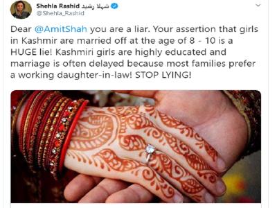 शेहला राशिद ने यह ट्वीट एक रिसर्च पर छपी स्टोरी को रिट्वीट करते हुए किया है। वह रिसर्च केन्द्र सरकार द्वारा जारी की है। दिसमें दावा किया गया है कि कश्मीर में लड़कियों की शादी सबसे जल्द की जाती है।