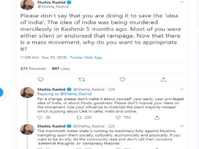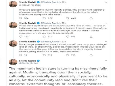 शेहला ने अपने एक अन्य ट्वीट में लिखा, ''ये मत कहिये की ये सब आपने 'आइडिया ऑफ इंडिया' को बचाने के लिए किया है। क्योंकि 'आइडिया ऑफ इंडिया' की पांच महीने पहले कश्मीर में जब हत्या की गई तो आप खामोश थे। और अब जब जनांदोलन बन गया है तो आप इसे अलग तरीके से क्यों पेश कर रहे हैं? भारत का ये राज्य मुस्लिमों पर अत्याचार करने के लिए आतुर हो गया उन्हें प्रताड़ित करने के लिए। अगर आप साथी बनना चाहते हैं तो, उनके संघर्ष को कट्टरवाद मत बताइए।