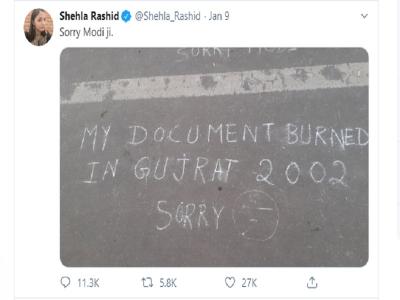 नागरिकता संशोधन कानून (CAA) और एनआरसी को लेकर पिछले महीने से जेएनयू छात्रसंघ की उपाध्यक्ष रह चुकीं शेहला राशिद सोशल मीडिया के जरिए विरोध कर रही हैं। शेहला राशिद के इस ट्वीट पर 27 हजार लाइक्स और 5.7 हजार रिट्वीट है। (खबर लिखे जाने तक)