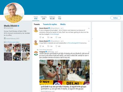 ट्विटर की बात करें तो शीला दीक्षित ने 5 जुलाई को अपना आखिरी ट्वीट किया था। जो आम बजट 2019-2020 को लेकर किया गया था। शीला दीक्षित ने लिखा था, ''ये आम बजट लोगों को निराश करने वाला था। देश की राजधानी दिल्ली को बजट में कुछ नहीं दिया गया है। उन्होंने यह भी लिखा था कि पिछले कुछ बजट में दिल्ली को कुछ नहीं दिया गया है।'' बता दें कि नरेन्द्र मोदी की सरकार ने पांच जुलाई को आम बजट पेश किया था।