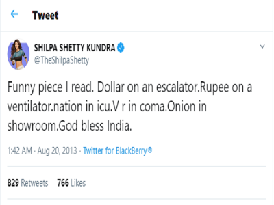 भारत में आर्थिक मंदी का दौर चल रहा है। जिसकी वजह से नरेन्द्र मोदी सरकारी की आलोचना हो रही है। इसी बीच बॉलीवुड एक्ट्रेस शिल्पा शेट्टी देश की आर्थिक स्थिति पर किये गये अपने एक ट्वीट को लेकर ट्रोल हो रही हैं। शिल्पा शेट्टी ने यह ट्वीट साल 2013 के अगस्त महीने में किया था। जिसमें उन्होंने आर्थिक मंदी पर वर्तमान सरकार पर तंज कसा था। शिल्पा शेट्टी ने ट्वीट में लिखा था, ''मैंने एक मजेदार चीज पढ़ी है, डॉलर एस्केलेटर पर है, रुपया वेंटिलेटर पर, नेशन आईसीयू में कोमा में है, प्याज शोरूम, भगवान भारत की मदद करे।'' शिल्पा ने 2013 में बढ़ी हुई महंगाई पर तंज करते हुए ये ट्वीट किया था।