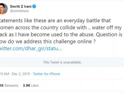 केंद्रीय कपड़ा मंत्री स्मृति ईरानी का एक ट्वीट चर्चा में आ गया है। उन्होंने दो दिसंबर की रात ट्वीट कर कहा कि उन्हे ऐसी गालियों की आदत हो गई है। असल में पूरा मामला हैदराबाद की 26 वर्षीय महिला डॉक्टर के साथ हुए गैंगरेप और हत्या से जुड़ा हुआ है। दो दिसंबर की सुबह स्मृति ईरानी ने बीजेपी के राष्ट्रीय प्रवक्ता अनिल बलूनी को ट्वीट कर जन्मदिन की बधाई दी। इसके बाद स्मति ईरानी को एक यूजर ने कमेंट में अपशब्दों का इस्तेमला किया। कमेंट इतना अशोभनीय था कि उसे ट्विटर द्वारा हटा दिया गया है। लेकिन उससे पहले ईरानी ने उस कमेंट को रिट्वीट करते हुए जवाब दिया। जो चर्चा का विषय बन गया है।