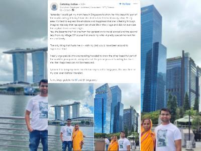 दरअसल, दत्तात्रेय जाधव नाम के एक शख्स ने लिंक्डइन पर अपनी मां के साथ सिंगापुर की तस्वीर पोस्ट की है। दत्तात्रेय ने खुशी जताते हुए तस्वीर के साथ भावुक पोस्ट भी लिखा है। शख्स ने पोस्ट में लिखा, "मुझे अपनी मां को सिंगापुर घुमाने का मौका मिला है। वह जिन भावनाओं को महसूस कर रही हैं उसे मैं शब्दों में नहीं लिख सकता। मेरी मां जो हमेशा गांव में ही रहीं। जिन्होंने कभी पास से हवाई जहाज तक नहीं देखा, वह अपनी पीढ़ी की पहली महिला है जिन्होंने विदेश यात्रा की है।"