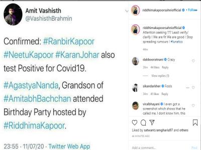 सोशल मीडिया पर वायरल हुई पोस्ट में यह दावा किया गया कि ये तीनों कोरोना के संपर्क में आए क्योंकि अमिताभ बच्चन के नाती अगस्त्य नंदा ने इसी सप्ताह की शुरुआत में नीतू की जन्मदिन की पार्टी में भाग लिया था, जिसे रिद्धिमा ने होस्ट किया था।
