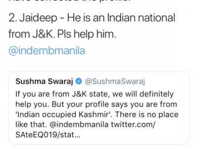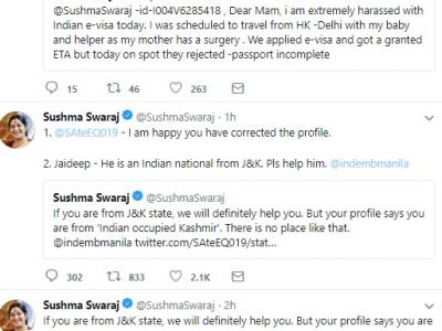 भारतीय विदेश मंत्री सुषमा स्वराज ट्विटर पर मदद माँगने वालों की तत्काल हेल्प करके काफी नाम कमा चुकी हैं। सुषमा स्वराज मानवीय आधार पर नरमदिली दिखाते हुए जरूरतमंदों की मुश्किलों का समाधान कराती रही हैं। लेकिन भारतीय विदेश मंत्री नरम दिल होने के साथ ही देशभक्त भी हैं और अपने इन दोनों गुणों के बीच संतुलन बनाना भी उन्हें खूब आता है। गुरुवार (10 मई) को एक कश्मीरी युवक ने ट्विटर पर सुषमा स्वराज से मदद माँगी। कश्मीरी युवक ने सुषमा स्वराज को ट्विटर पर टैग करके कहा कि उसका पासपोर्ट डैमेज हो गया है और उसे सफर करने के लिए तत्काल नया पासपोर्ट चाहिए। कश्मीरी युवक के ट्वीट का जवाब देते हुए विदेश मंत्री ने कहा कि आपके प्रोफाइल पर लिखा है कि आप भारतीय होते तो हम जरूर आपकी मदद करते लेकिन आपके प्रोफाइल पर लिखा है कि आप "भारत के कब्जे वाले कश्मीर" में रहते हैं और ऐसी कोई जगह नहीं है।