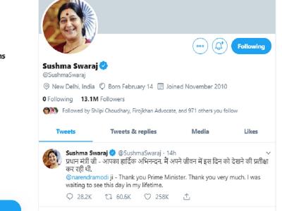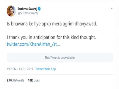 — Sushma Swaraj (@SushmaSwaraj) July 21, 2019