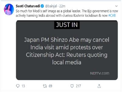 नागरिकता संशोधन विधेयक (कैब) के खिलाफ हो रहे विरोध प्रदर्शन के बीच समाचार एजेंसी रॉयटर्स ने लोकल मीडिया के हवाले से खबर दी है कि जापान के प्रधानमंत्री शिंजो अबे अपना भारत दौरा रद्द कर सकते हैं। इस बात पर पत्रकार और कॉलमनिस्ट स्वाति चतुर्वेदी ने प्रधानमंत्री नरेंद्र मोदी पर निशाना साधा है। ट्वीट करते हुए स्वाति चतुर्वेदी ने लिखा है, ''देखिए पीएम मोदी ने एक ग्लोबल लीडर के तौर पर क्या सेल्फ इमेज बनाई है। बीजेपी सरकार अब सक्रिय रूप से भारत को नुकसान पहुंचाने में लगी है। पहले कश्मीर को लॉकडाउन कर और अब विदेश ओर कैब के जरिए।''