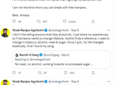 एक अन्य ट्वीट में विवेक ने कहा कि किसी को क्या खाना चाहिए ये बताना मुझे पसंद नहीं। मैं सिर्फ अपने अनुभव साझा करता हूं। विवेक ने लिखा- मुझे किसी को यह बताना पसंद नहीं है कि उन्हें क्या करना चाहिए। मैं सिर्फ अपने अनुभव साझा करता हूं ताकि अगर कोई जीवन शैली बदलना चाहता है, तो वह एक संदर्भ ढूंढता है। मैं तंबाकू, शराब, मांस और चीनी का सेवन करता था। एक बार जब मैंने छोड़ दी, तो मेरा जीवन काफी बदल गया। और मुझे मेरा गीत मिल गया।