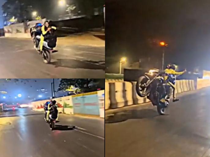 मुंबई: महाराष्ट्र की राजधानी मुंबई में खुली सड़क पर कुछ लोगों के बाइक स्टंट का वीडियो तेजी से वायरल हो रहा। वीडियो में एक बाइक पर तीन लोग सवार है जो कि खतरनाक स्टंट कर रहे हैं।