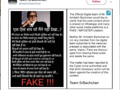पोस्ट वायरल होने के बाद अमिताभ बच्चन की सोशल मीडिया टीम आगे आई और उन्होंने इस पोस्ट को खारिज किया। Team SrBachchan की तरफ से लिखे गए मैसेज के अनुसार, ना ही अमिताभ बच्चन और न ही उनकी डिजिटल टीम के किसी सदस्य ने अपनी तरफ से कोई भी ऐसा ट्वीट किया है। इस खबर से अमिताभ बच्चन और उनकी टीम का दूर-दूर तक कोई वास्ता नहीं है। सभी से निवेदन है कि अगर उन्हें ये खबर मिले तो उसे आगे ना बढ़ाएं और अपने पेज से डिलीट कर दें। साथ ही टीम ने इस पोस्ट को लेकर साइबर क्राइम अथॉरिटीज में शिकायत दर्ज करा दी है। आरोपियों पर जल्द ही कार्रवाई होगी।