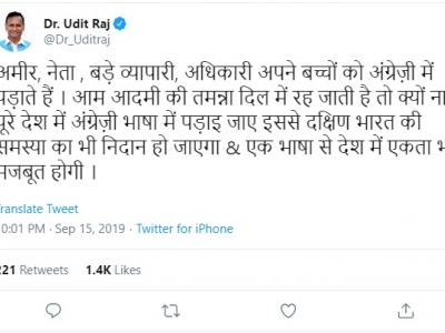 क्या किया था उदित राज ने ट्वीट ''अमीर, नेता , बड़े व्यापारी, अधिकारी अपने बच्चों को अंग्रेज़ी में पड़ाते हैं। आम आदमी की तमन्ना दिल में रह जाती है तो क्यों ना पूरे देश में अंग्रेज़ी भाषा में पड़ाइ जाए इससे दक्षिण भारत की समस्या का भी निदान हो जाएगा & एक भाषा से देश में एकता भी मजबूत होगी।''