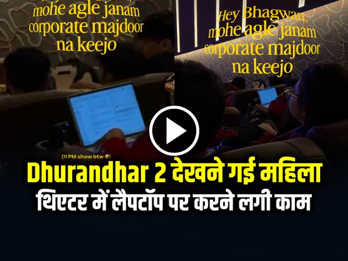 Viral Video: फिल्म 'धुरंधर 2: द रिवेंज' हाल ही में सिनेमाघरों में रिलीज हुई है, दर्शकों के बीच फिल्म का काफी क्रेज देखा जा रहा है। वायरल वीडियो में रात 11 बजे का शो देखने गई एक महिला फिल्म देखते हुए अचानक अपना लैपटॉप निकाल कर ऑफिस का काम करने लगती है, ये वीडियो सोशल मीडिया पर तेजी से वायरल हो रहा है। सोशल मीडिया इंफ्लुएंसर ने वीडियो शेयर की है और वीडियो पर बड़ा-बड़ा लिखा है, 'Hai Bhagwan! Mohe agle janam corporate majdoor na keejo' ये नजारा देखकर आप कॉर्पोरेट लाइफ की हकीकत का अंदाजा लगा सकते हैं। Dhurandhar 2 हाल ही में 19 मार्च 2026 को रिलीज हुई है। फिल्म में रणवीर सिंह, आर माधवन, अर्जुन रामपाल, संजय दत्त, अक्षय खन्ना जैसे बड़े स्टार्स हैं।