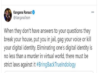 बॉलीवुड एक्ट्रेस कंगना रनौत भी इस बहस में पीछे नहीं रहीं। उन्होंने आईपीएस अधिकारी के खिलाफ लिखा, 'जब इनके पास कोई जवाब नहीं होता है तो ये आपका घर तोड़ देते हैं, आपको जेल में जेल में डाल देते हैं या आपकी डिजिटल पहचान को खत्म करते हैं। किसी की डिजिटल पहचान को आज के दौर में खत्म करना हत्या से कम नहीं है, इसके खिलाफ सख्त काननू होने चाहिए।'