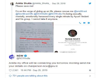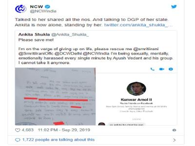 सोशल मीडिया पर 29 सितंबर रात 10 बजकर 44 मिनट पर केंद्रीय मंत्री स्मृति ईरानी ने एक ट्वीट को रिट्वीट किया। ट्वीट में लिखा था, ''अंकिता मेरे ऑफिस वाले आपसे कल सम्पर्क करेंगे, आप अपनी जानकारी महिला आयोग को दे दो।'' असल में अंकिता शुक्ला नाम की लड़की ने ट्विटर पर रात करीब साढ़े आठ बजे स्मृति ईरानी और महिला आयोग से मदद मांगी। अंकिता ने अपने ट्वीट में लिखा, प्लीज मुझे बचा लीजिए। मैं अपनी जिंदगी खत्म कर लूंगी। मुझे हर मिनट शारीरिक, मानसिक और भावनात्मक शोषण का सामना करना पड़ रहा है।" अंकिता ने अपने ट्वीट के साथ जमशेदपुर के साइबर क्राइम थाने में दर्ज रिपोर्ट की एक कॉपी और एक शख्स का फेसबुक प्रोफाइल शेयर किया था। अंकिता ने यह शिकायत 16 सितंबर 2019 को रिसीव किया गया था।