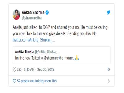 अंकिता के इस ट्वीट को राष्ट्रीय महिला आयोग ने भी रिट्वीट करते हुए लिखा, "अंकिता से हमारी बात हो गई है और उनसे जानकारियां मांगी गई हैं। उनके राज्य के डीजीपी से भी बात की गई है। हम अंकिता के साथ हैं, उन्हें इंसाफ जरूर मिलेगा।"