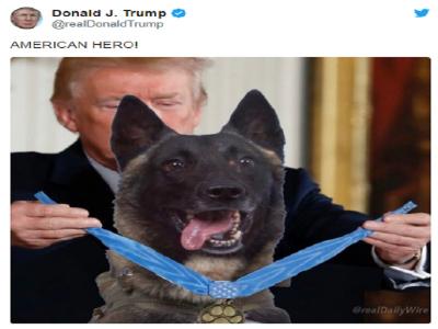 अमेरिकी राष्ट्रपति ने कुत्ते की फोटो के साथ ट्वीट किया, 'अमेरिकी नायक।' उन्होंने कहा कि इस कुत्ते ने सीरियाई सुरंग में बगदादी के खुद को उड़ाने से पहले उसका पीछा किया था।