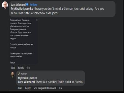 इस मामले में जर्मन पत्रकार लार्स वियनैंड डिप्टी मेयर से पूछा कि क्या वो अपनी टिप्पणी को लेकर गंभीर हैं। लार्स वियनैंड ने कहा, "क्या आप गंभीर हैं या यह किसी तरह का भद्दा मजाक है?" इस पर मायखाइलो लिसेंको ने गंभीर होकर दावा किया, “यह उसी तरह से है जैसे पुतिन ने रूस में किया था।”