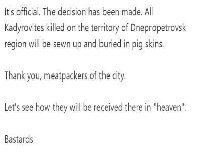 यूक्रेने के नीप्रो शहर के डिप्टी मेयर मायखाइलो लिसेंको ने टेलीग्राम पर लिखा है कि यह आधिकारिक निर्णय लिया गया है कि निप्रो क्षेत्र में मारे गए सभी कादिरोविट्स (रूस के नेशनल गार्ड से संबंधित चेचन लड़ाके) को सुअर के चमड़े में सिल कर दफन किया जाएगा।
