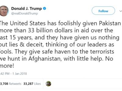 अमेरिका राष्ट्रपति डोनाल्ड ट्रंप ने सोमवार (एक जनवरी) को पाकिस्तान को झूठा और धोखेबाज बताया। ट्रंप ने सोमवार देर शाम ट्वीट किया, "अमेरिका बेवकूफी करते हुए पाकिस्तान को पिछले 15 सालों में 33 अरब डॉलर से ज्यादा की आर्थिक मदद दे चुका है। बदले में उसे झूठ और धोखे के सिवा कुछ नहीं मिला। पाकिस्तान हमारे नेताओं को बेवकूफ समझता है। हम जिन आतंकवादियों को अफगानिस्तान में खोज रहे थे उन्हें पाकिस्तान ने पनाह दे रखी थी। अब और नहीं!" ट्रंप के बयान से साफ हो गया कि अमेरिका पाकिस्तान को दी जाने वाली 25.5 करोड़ डॉलर (करीब 1600 करोड़ रुपये) की मदद नहीं देगा।