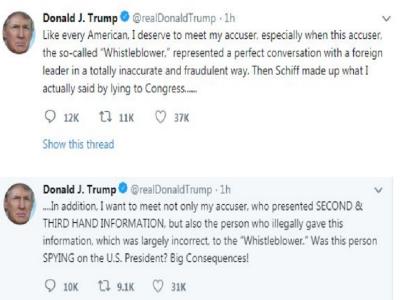 ट्रंप ने ट्वीट किया, 'हर अमेरिकी की तरह मुझे भी मुझ पर आरोप लगाने वाले से मिलने का हक है, खासकर जब यह आरोप लगाने वाला, और तथा कथित 'व्हिशलब्लोअर' जिसने एक विदेशी नेता के साथ सही बातचीत को पूरी तरह तथ्यहीन और गलत तरीके से पेश किया।'