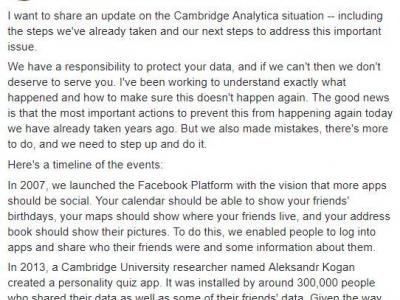 न्यूयोर्क, 22 मार्च; फेसबुक यूजर्स के डेटा लीक स्कैंडल को लेकर फेसबुक के सीईओ मार्क जकरबर्ग ने अपनी गलती मान ली है। उन्होंने कहा कि यूजर्स की प्रिवेसी को बनाए रखने के लिए हम इसपर जल्द काम करना शुरू कर देंगे। मार्क जकरबर्ग ने 21 मार्च की रात (भारत के समय अनुसार) तकरीबन 1 बजे फेसबुक पर पोस्ट कर के इस बात की जानकारी दी है।