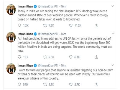 एक अन्य ट्वीट में इमरान खान ने लिखा, ''संयुक्त राष्ट्र महासभा को दिए संबोधन में मैंने पहले ही भविष्यवाणी कर दी थी कि जब जिन्न बोतल से बाहर आएगा, खूनखराबे का और बुरा दौर शुरू हो जाएगा। कश्मीर एक शुरुआत थी। अब भारत के 20 करोड़ मुस्लिमों को निशाना बनाया जा रहा है। अंतरराष्ट्रीय समुदाय को इसपर फौरन एक्शन लेना चाहिए।''