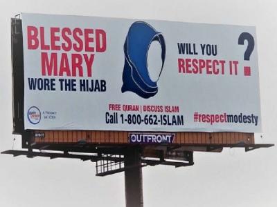 एक होर्डिंग में मैरी को हिजाब पहने हुए दिखाया गया है और लिखा है, ‘‘भाग्यशाली मैरी ने हिजाब पहना था। क्या आप इसका सम्मान करेंगे?’’
