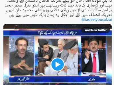 मीर ने ट्वीट करते हुए लिखा, "यह मौलाना इकबाल खान हैं, जो पहले तहरीक-ए-तालिबान पाकिस्तान से जुड़े थे और गिरफ्तारी के बाद जेल में थे..." उन्होंने ये भी कहा कि खान को शांति वार्ता की आड़ में लेफ्टिनेंट जनरल फैज हमीद (सेवानिवृत्त) द्वारा मुक्त किया गया था और खैबर पख्तूनख्वा के तत्कालीन मुख्यमंत्री महमूद खान द्वारा पीटीआई का हिस्सा बनाया गया था।