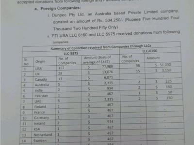 चुनाव आयोग ने अपने फैसले में कहा कि यह पाया गया है कि पूर्व सत्ताधारी पार्टी पीटीआई ने 34 विदेशी चंदे लिए हैं। ये चंदे भारत सहित अमेरिका, ऑस्ट्रेलिया और यूएई से लिए गए। इतना ही नहीं दुबई में रहने वाले पाकिस्तानी उद्योगपति आरिफ नकवी से फंड मिला और 13 अकाउंट्स की जानकारी छिपाई। चुनाव आयोग ने यह भी कहा कि पीटीआई ने भारतीय मूल की यूएस-आधारित व्यवसायी रोमिता शेट्टी द्वारा भी चंदे लिए। रोमिता शेट्टी द्वारा पीटीआई को 13, 750 यूएस डॉलर का चंदा मिला जो विदेशी नागरिकों द्वारा दान पर प्रतिबंध और पाकिस्तानी कानूनों के उल्लंघन से प्रभावित है।